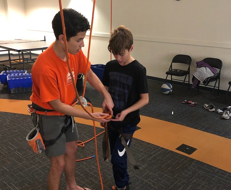 Teach and assist with proper fit of equipment, how to tie in, how to belay with a GriGri/Carabiner combination, teach safety check, dialogue, and communicate with climbers when needed.